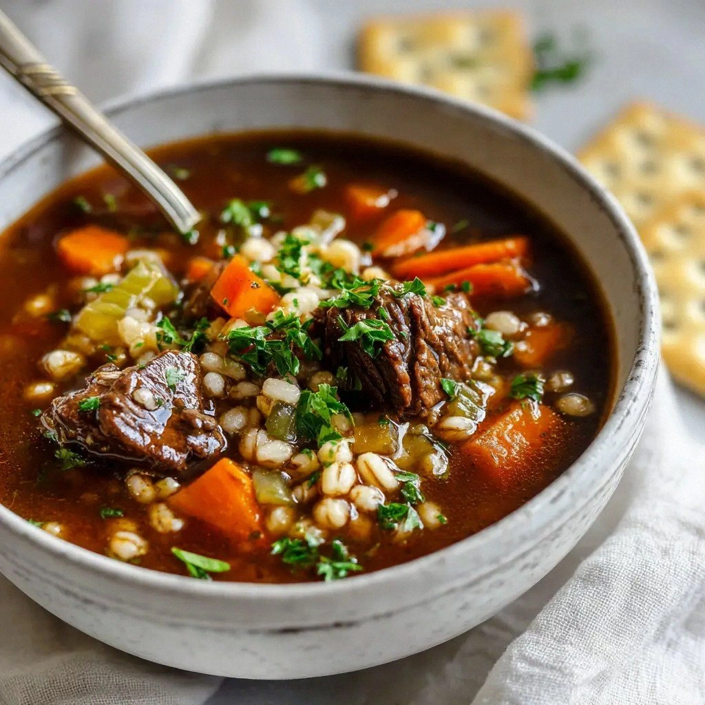 " Dive into a hearty bowl of beef, barley, and garden veggies simmered to silky perfection. Tender chuck, earthy barley, sweet corn, and peas mingle in a savory broth, finished with a splash of Worcestershire and a sprinkle of parsley. This comforting soup is a flavor‑packed, protein‑rich delight that turns any day into a cozy gathering."