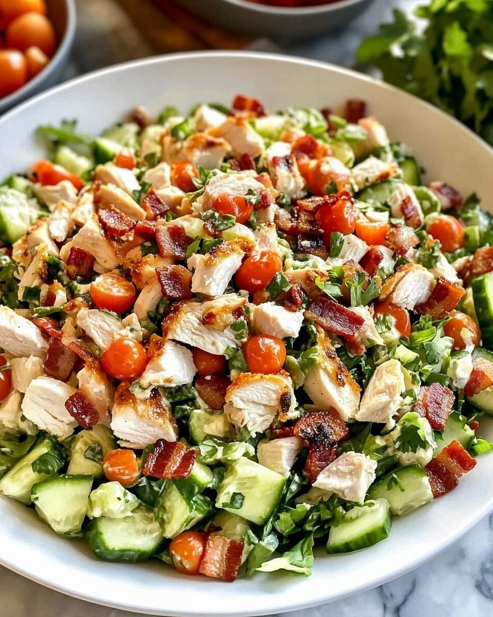 What makes this version stand out is not just the ingredients, but the way they interact. The bacon is crisped to perfection and then chopped into bite‑sized pieces, giving every forkful a satisfying crunch that contrasts with the tender chicken. The ranch dressing is not a simple drizzle; it's blended into the salad so that each leaf is coated like velvet, ensuring no flavor is left behind. The addition of toasted almonds and blue cheese adds layers of texture and a subtle tang that elevates the dish beyond the ordinary.
