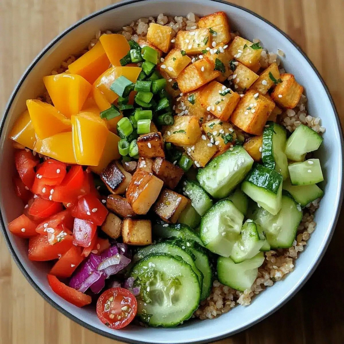 Cucumber, cherry tomatoes, and red bell pepper form the crunchy, juicy trio that delivers color and freshness. The cucumber keeps the bowl cool and hydrating, the tomatoes add a sweet burst, and the bell pepper brings a mild heat and vibrant color. Removing any of these veggies will change the overall balance, making the dish feel less vibrant. For a twist, try adding sliced radishes or a handful of spinach for extra greens.